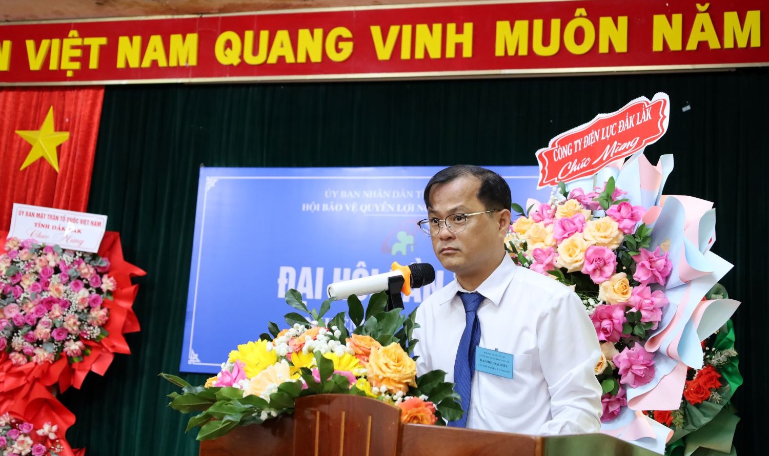 Đại diện UBMTTQ Việt Nam tỉnh tặng hoa chúc mừng Hội Bảo vệ Quyền lợi người tiêu dùng tỉnh Đắk Lắk