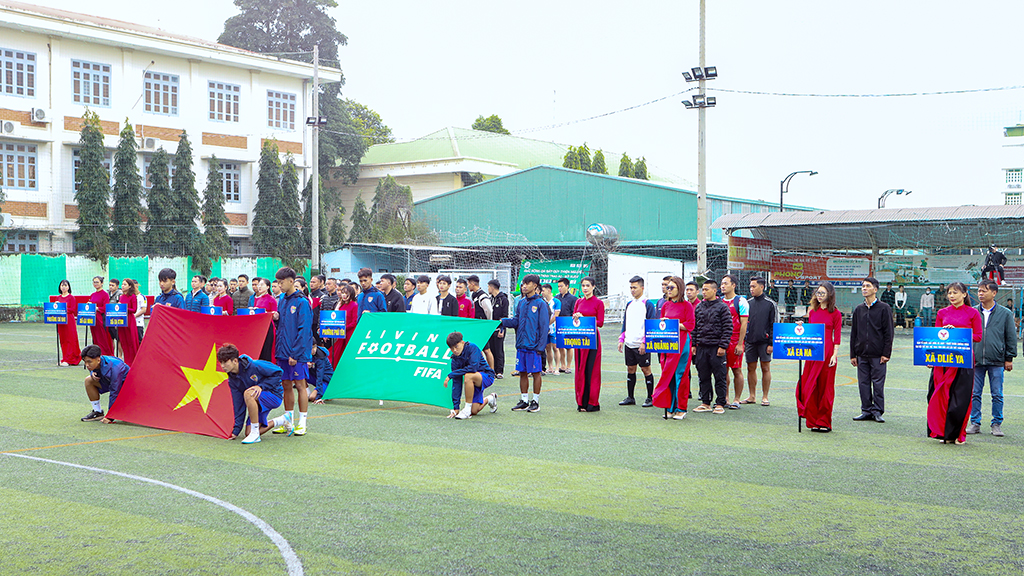 Trận cầu khai mạc giải giữa đội phường Buôn Hồ và xã Ea Ning (trang phục đỏ) có kết quả hai đội hòa 0-0.