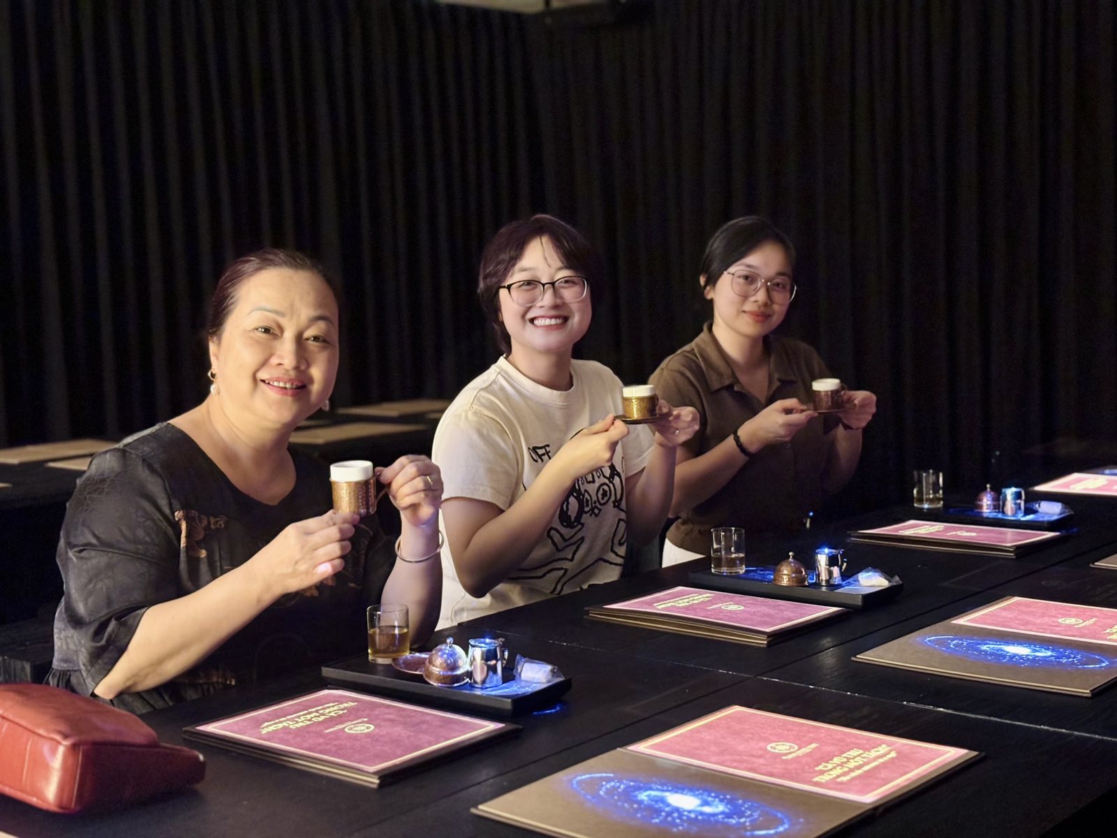 Du khách tham gia show trình diễn kết hợp công nghệ 3D Mapping hiện đại, văn hóa cà phê thế giới và nghệ thuật pha chế Barista - Ảnh: Bảo tàng thế giới cà phê