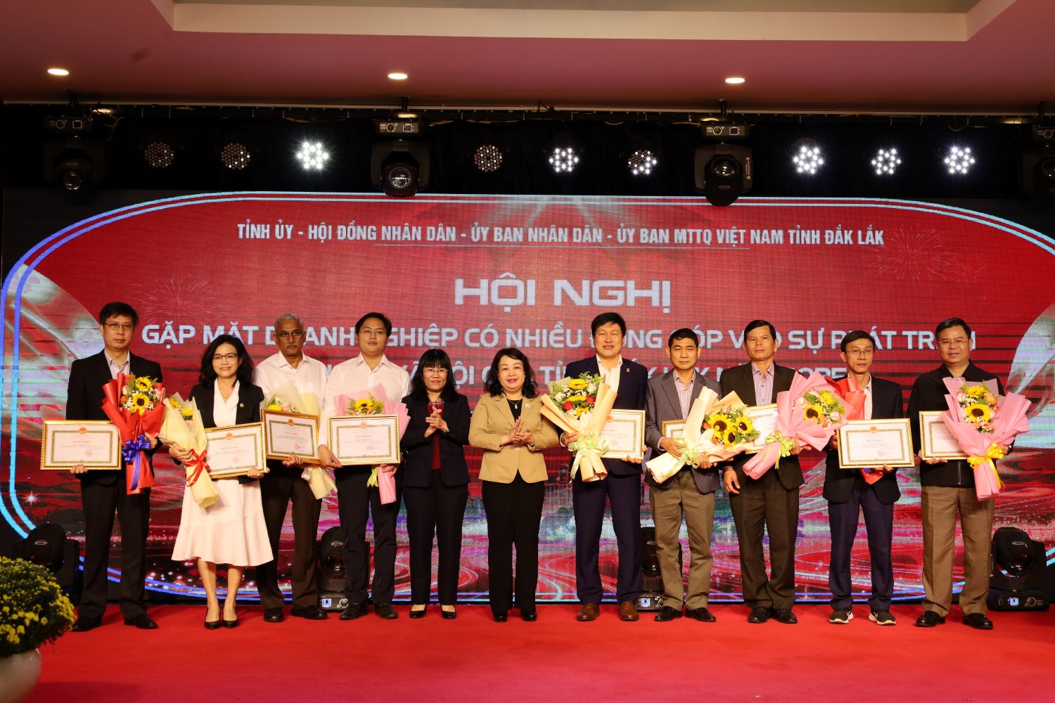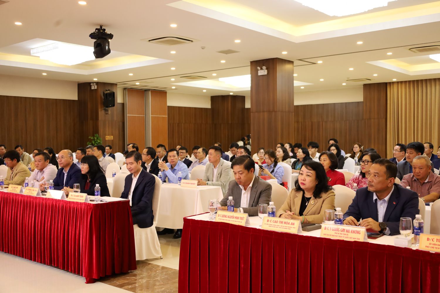 Tham dự hội nghị có các đồng chí: Lương Nguyễn Minh Triết, Ủy viên Trung ương Đảng, Bí thư Tỉnh ủy; Cao Thị Hòa An, Ủy viên Trung ương Đảng, Phó Bí thư Thường trực Tỉnh ủy, Chủ tịch HĐND tỉnh; Tạ Anh Tuấn, Phó Bí thư Tỉnh ủy, Chủ tịch UBND tỉnh; Y Giang Gry Niê Knơng, Phó Bí thư Tỉnh ủy, Chủ tịch Ủy ban MTTQ Việt Nam tỉnh; Hồ Thị Nguyên Thảo, Ủy viên Ban Thường vụ Tỉnh ủy, Phó Chủ tịch Thường Trực UBND tỉnh; các đồng chí Ủy viên Ban Thường vụ Tỉnh ủy; các Phó Chủ tịch UBND tỉnh: Đào Mỹ, Trương Công Thái; đại diện lãnh đạo các sở, ban, ngành, đơn vị trên địa bàn tỉnh; đại diện lãnh đạo các hội, hiệp hội doanh nghiệp và 100 doanh nghiệp, nhà đầu tư đã có nhiều đóng góp vào sự phát triển kinh tế - xã hội của tỉnh trong năm 2025.