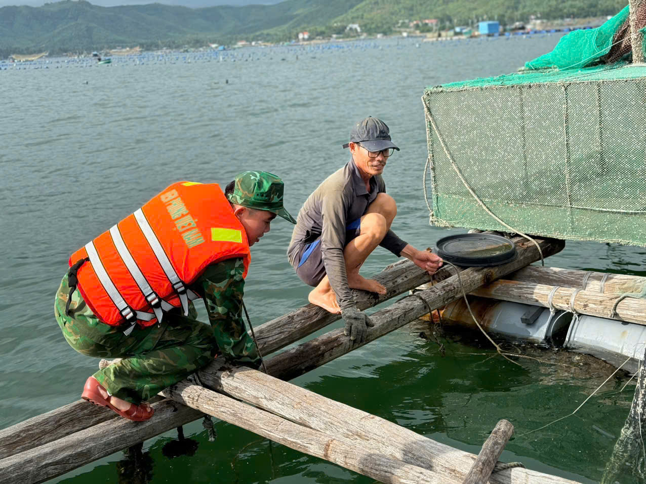 Lực lượng chức năng cùng ngư dân khu vực phía Đông tỉnh Đắk Lắk kiểm tra, gia cố lồng bè nuôi trồng thủy sản trước thời điểm bão đổ bộ.