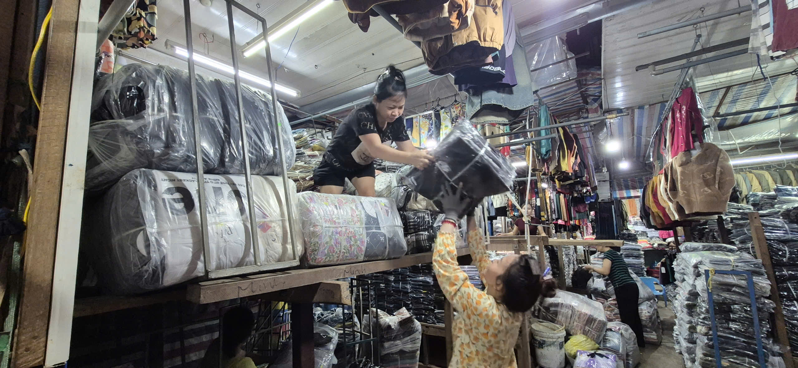 Tiểu thương chủ động kê hàng hóa lên cao để tránh thiệt hại do bão.