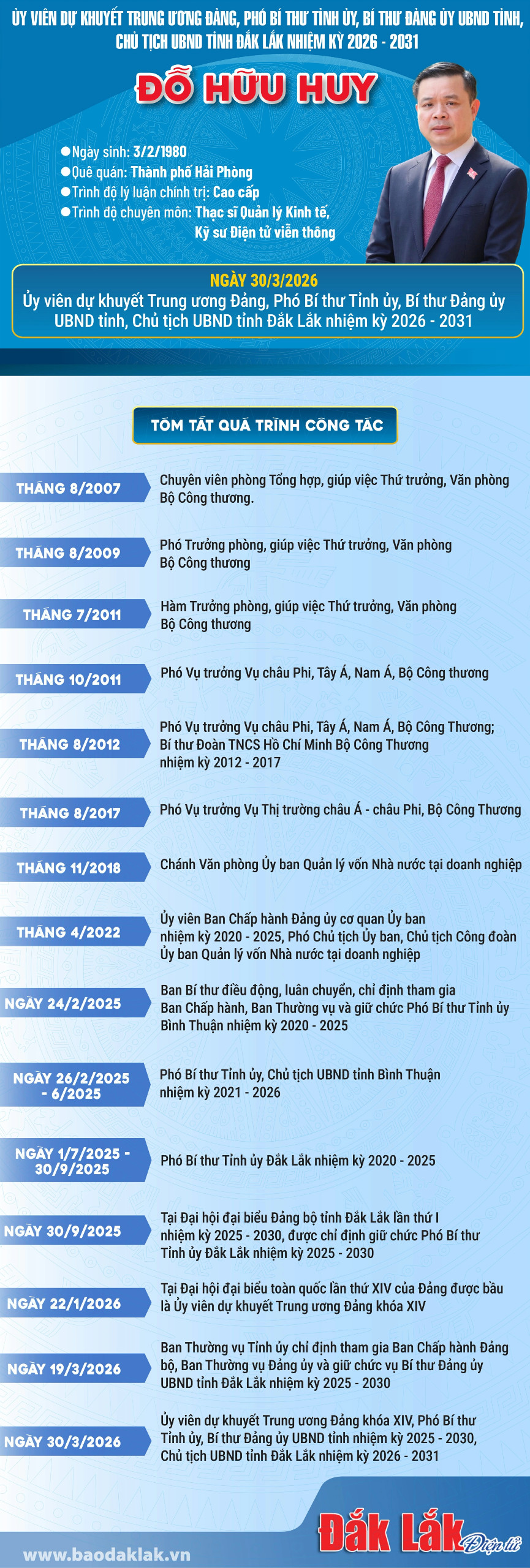 (Infographic) Tân Chủ tịch UBND tỉnh Đắk Lắk nhiệm kỳ 2026 - 2031 Đỗ Hữu Huy