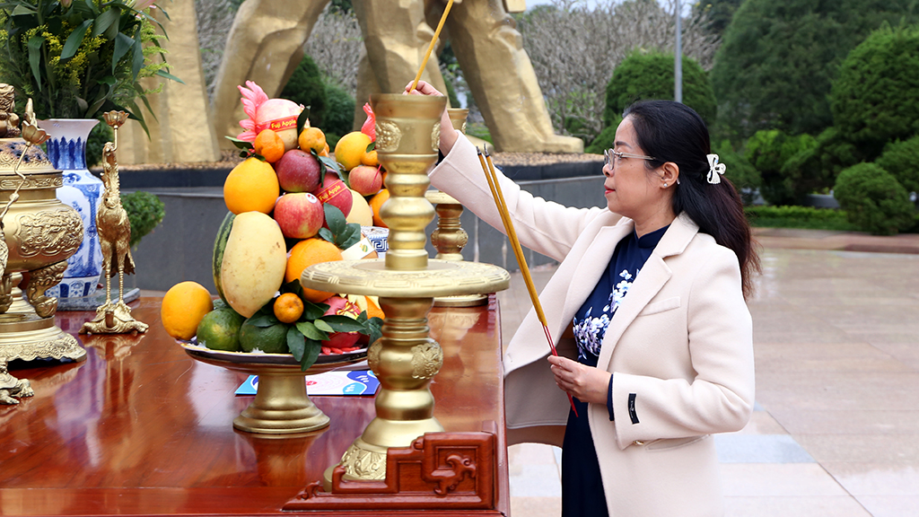 Đồng chí Huỳnh Thị Chiến Hòa - Phó Bí thư Thường trực Tỉnh ủy, Chủ tịch HĐND tỉnh thắp hương tưởng nhớ công lao to lớn của các anh hùng liệt sỹ.
