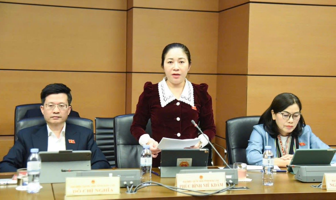 Đại biểu Phúc Bình Niê Kđăm - Phó Trưởng Ban Tuyên giáo và Dân vận Tỉnh ủy đóng góp ý kiến tại phiên thảo luận (Ảnh: Đoàn đại biểu Quốc hội tỉnh cung cấp).
