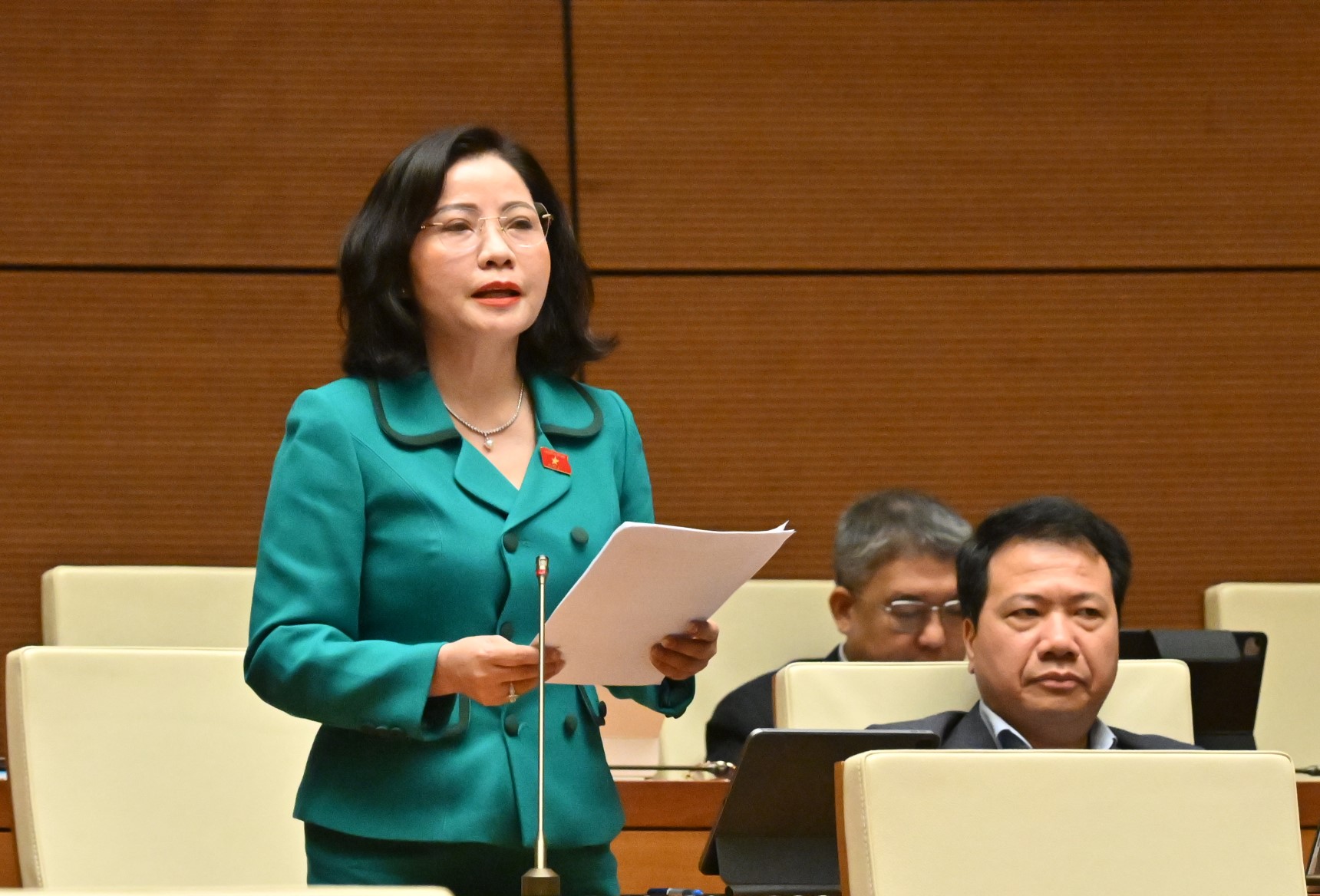 Phó Trưởng đoàn chuyên trách phụ trách Đoàn đại biểu Quốc hội tỉnh Đắk Lắk Nguyễn Thị Thu Nguyệt phát biểu thảo luận tại hội trường.