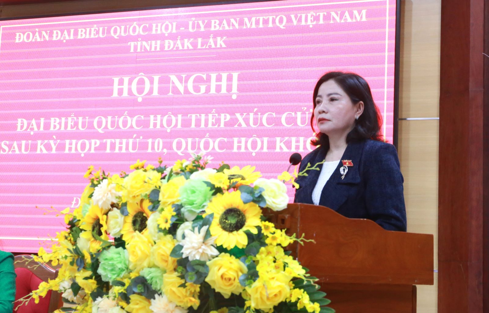 Hội nghị tiếp xúc cử tri sau Kỳ họp thứ 10 là đợt tiếp xúc cử tri cuối cùng của Đoàn đại biểu Quốc hội tỉnh trong nhiệm kỳ Quốc hội khóa XV; ngày 15/3/2026 sẽ diễn ra cuộc bầu cử đại biểu Quốc hội khóa XVI và đại biểu HĐND các cấp, nhiệm kỳ 2026-2031. Phó Trưởng đoàn chuyên trách phụ trách Đoàn đại biểu Quốc hội tỉnh Nguyễn Thị Thu Nguyệt thay mặt Đoàn đại biểu Quốc hội tỉnh trân trọng cảm ơn sự tin tưởng, đồng hành của cấp ủy, chính quyền địa phương và cử tri trong suốt hành trình 5 năm qua. Nhiều kiến nghị của cử tri đã được Đoàn gửi tới Quốc hội, Chính phủ và các cơ quan của tỉnh và được xem xét, giải quyết.