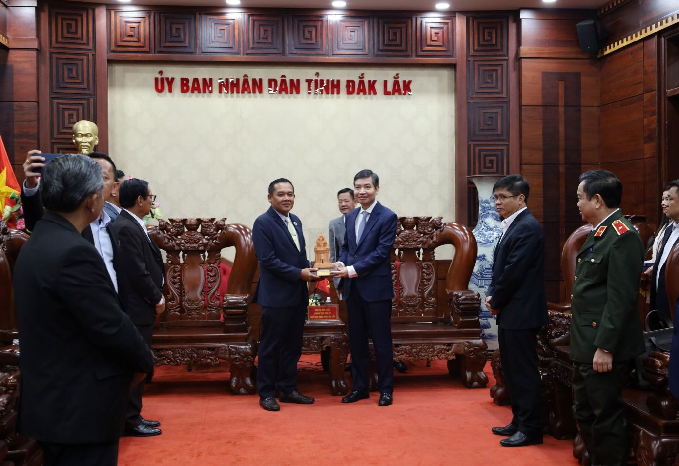 Chủ tịch UBND tỉnh Đắk Lắk Tạ Anh Tuấn tặng quà cho Đoàn công tác tỉnh Mondulkiri, Vương quốc Campuchia