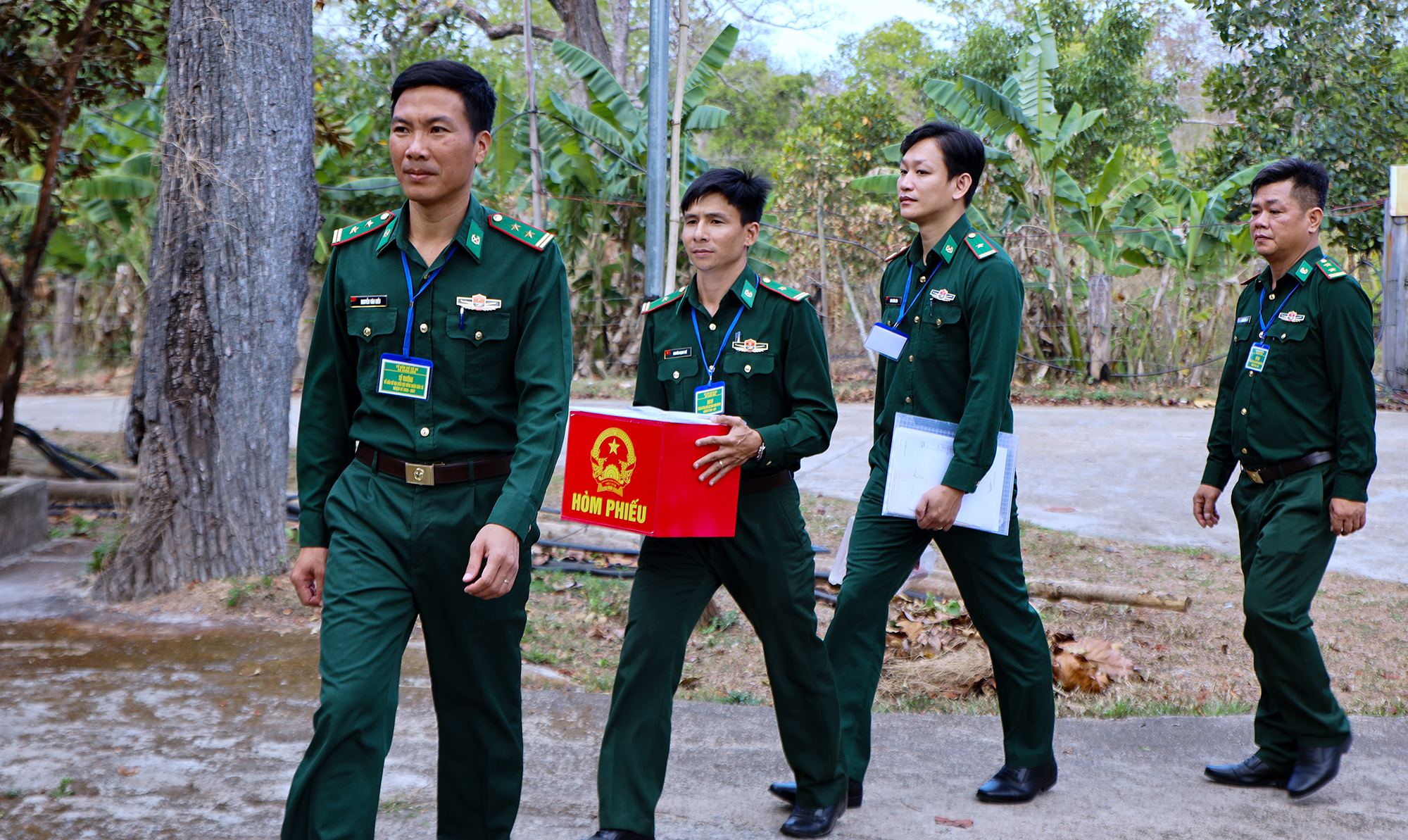 Tổ kiểm phiếu mang thùng phiếu phụ đến các tổ công tác đang thực hiện nhiệm vụ sẵn sàng chiến đấu trên tuyến biên giới.