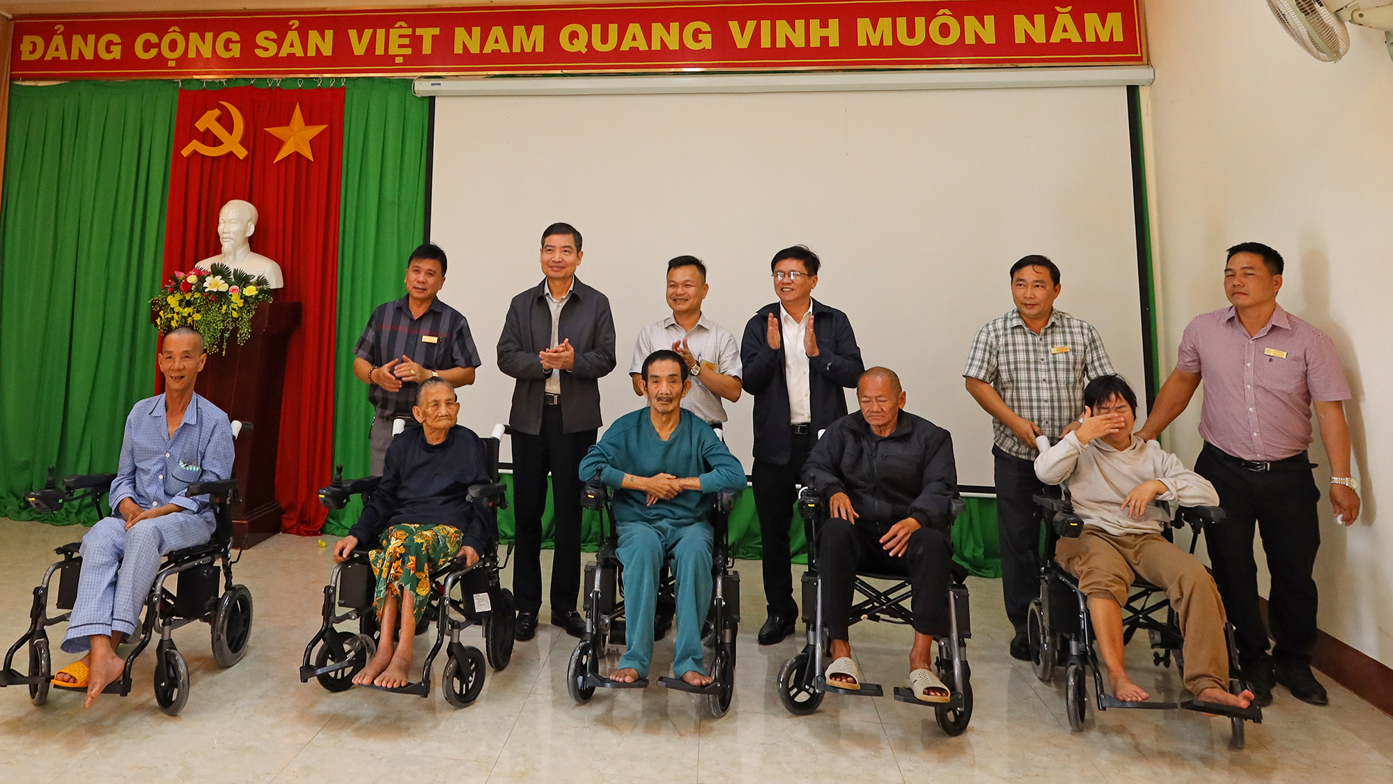 Đồng chí Tạ Anh Tuấn - Phó Bí thư Tỉnh ủy, Chủ tịch UBND tỉnh trao xe lăn điện tặng các đối tượng tại Trung tâm Bảo trợ xã hội và Trẻ em tỉnh.