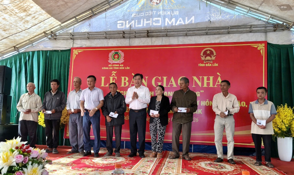 Chiều 10/1, tại xã Tây Hòa, Công an tỉnh Đắk Lắk phối hợp với chính quyền địa phương tổ chức bàn giao nhà mới cho 15 hộ gia đình có nhà bị sập đổ hoàn toàn sau đợt mưa lũ vừa qua. Tham dự có đồng chí Trần Hữu Thế, Ủy viên Ban Thường vụ Tỉnh ủy, Phó Chủ tịch Thường trực Ủy ban MTTQ Việt Nam tỉnh; Thiếu tướng Phan Thanh Tám, Ủy viên Ban Thường vụ Tỉnh ủy, Giám đốc Công an tỉnh; Đào Mỹ, Phó Chủ tịch UBND tỉnh cùng các đơn vị và đại biểu liên quan.