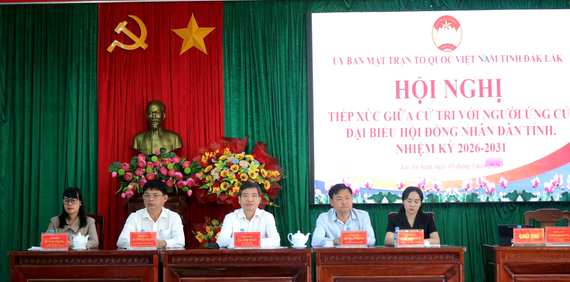 Sáng 3/3, Ủy ban MTTQ Việt Nam tỉnh Đắk Lắk tổ chức hội nghị tiếp xúc giữa cử tri và những người ứng cử đại biểu HĐND tỉnh, nhiệm kỳ 2026 - 2031 tại Đơn vị bầu cử số 3. Hội nghị được triển khai theo hình thức trực tiếp tại xã Tuy An Nam và trực tuyến đến các điểm cầu phường Bình Kiến và xã Phú Hòa 2.