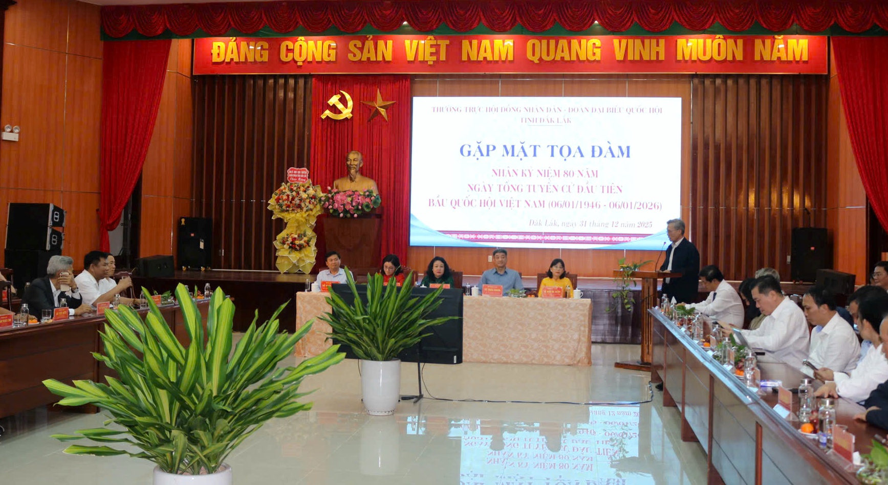Nhân kỷ niệm 80 năm Ngày Tổng tuyển cử đầu tiên bầu Quốc hội Việt Nam (06/01/1946 - 06/01/2026), chiều ngày 31/12, tại Tỉnh ủy cơ sở 2 (phường Bình Kiến), Thường trực HĐND tỉnh phối hợp với Đoàn đại biểu Quốc hội tỉnh tổ chức buổi gặp mặt, tọa đàm nhằm ôn lại truyền thống vẻ vang của Quốc hội Việt Nam và trao đổi, chia sẻ kinh nghiệm trong hoạt động của cơ quan dân cử qua các thời kỳ.