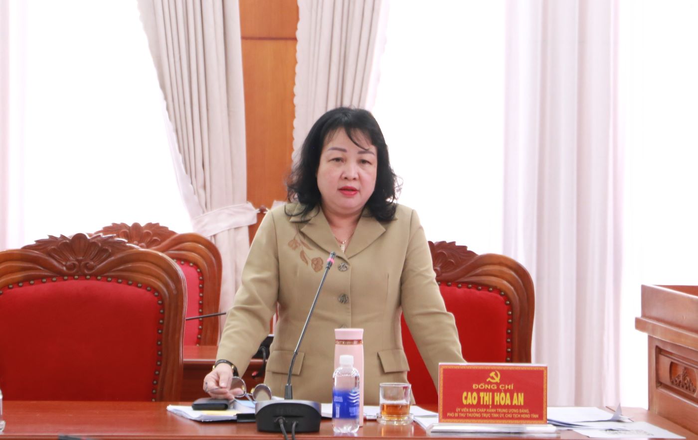 Đồng chí Cao Thị Hòa An - Ủy viên Ban Chấp hành Trung ương Đảng, Phó Bí thư Thường trực Tỉnh ủy, Chủ tịch HĐND tỉnh, Chủ tịch Ủy ban Bầu cử tỉnh phát biểu tại hội nghị.