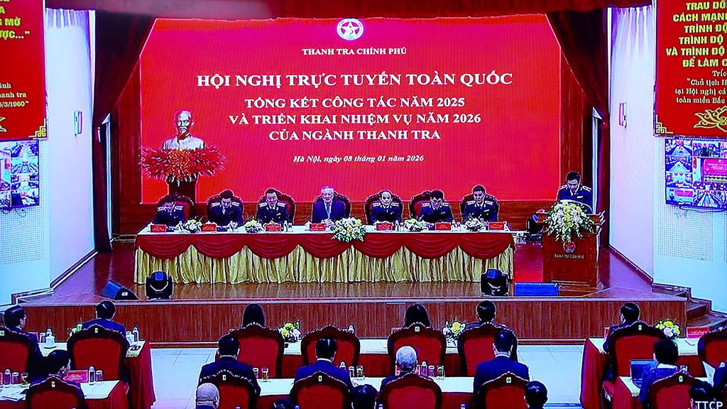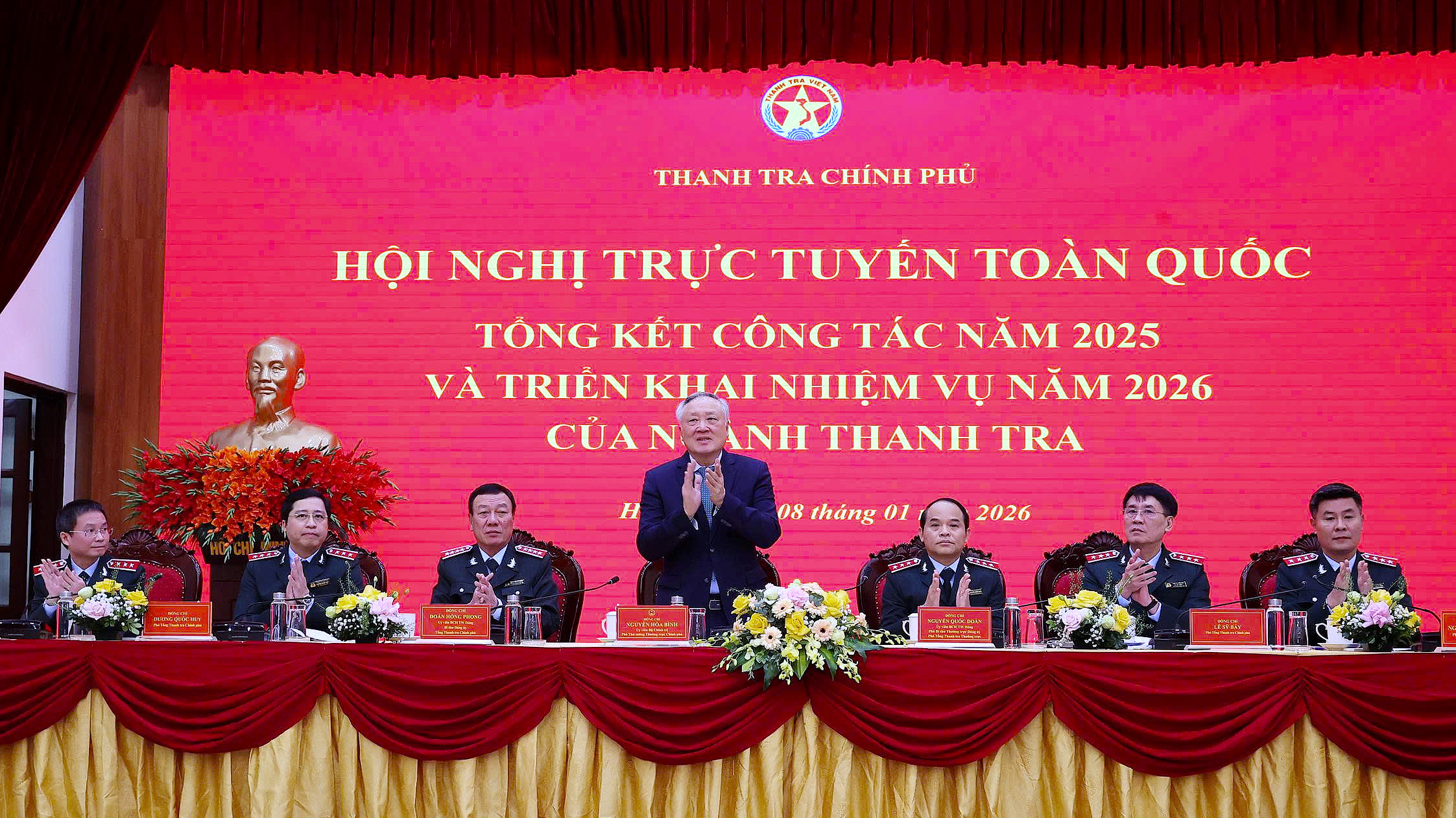 Chiều 08/1, Thanh tra Chính phủ tổ chức Hội nghị trực tuyến toàn quốc tổng kết công tác năm 2025 và triển khai nhiệm vụ năm 2026 của ngành Thanh tra. Dự và chủ trì Hội nghị tại điểm cầu chính có Phó Thủ tướng Thường trực Chính phủ Nguyễn Hòa Bình; Tổng Thanh tra Chính phủ Đoàn Hồng Phong và các Phó Tổng Thanh tra Chính phủ.