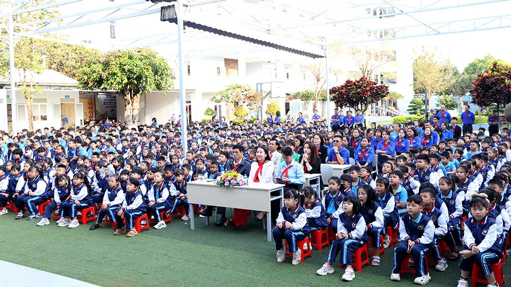 Đại biểu và các em thiếu nhi tại điểm cầu Liên đội trường TH-THCS Nguyễn Khuyến, thành phố Buôn Ma Thuột, tỉnh Đắk Lắk.