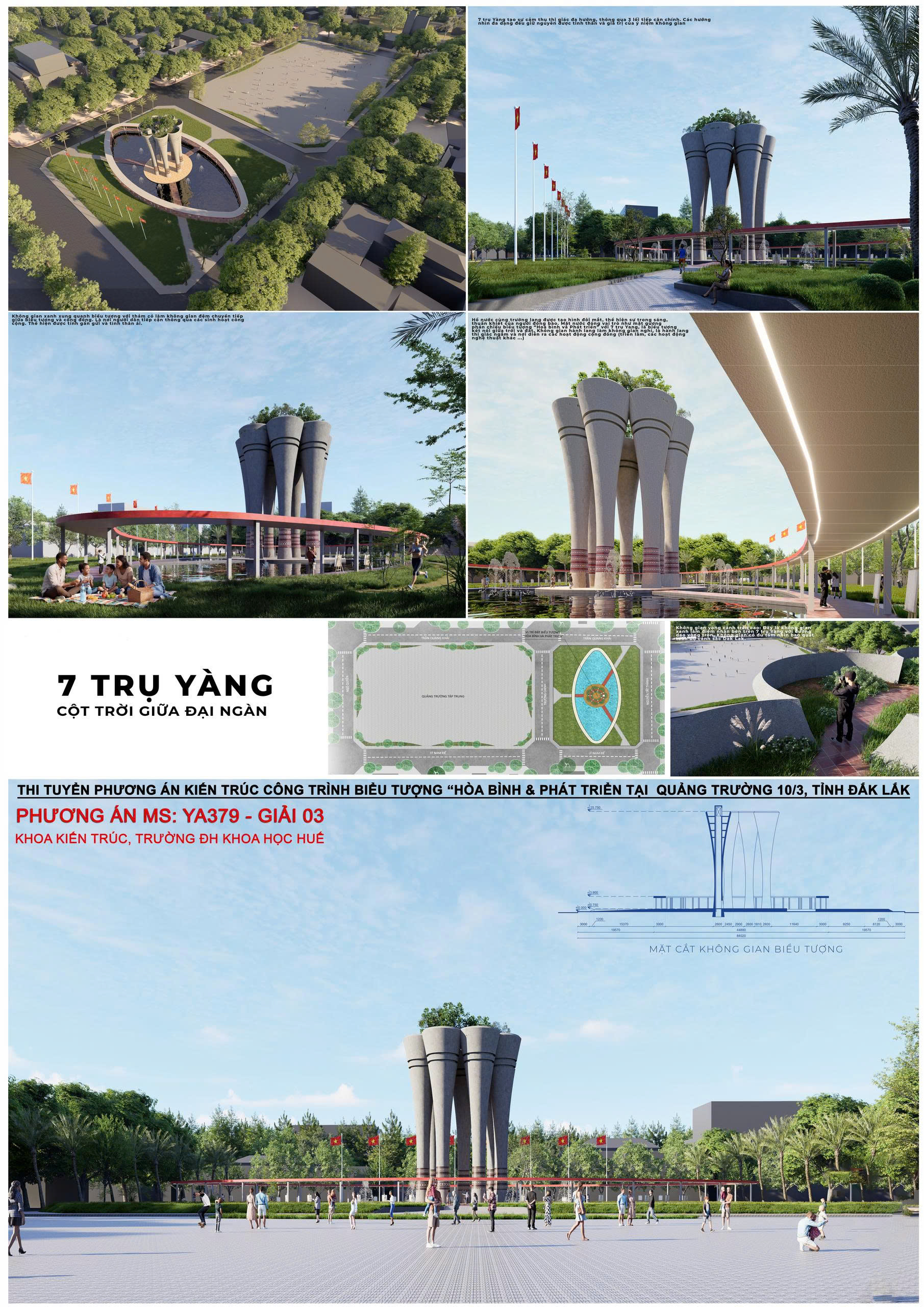 Cụ thể, Giải Nhất đã thuộc về phương án mã số PS 103 của Công ty TNHH Pedestrians với tổng số điểm ấn tượng là 88,4 điểm. Giải Nhì được trao cho phương án DL 047 của Công ty Cổ phần Tư vấn Xây dựng Đắk Lắk đạt 79,8 điểm. Giải Ba thuộc về phương án YA 379 đến từ Khoa Kiến trúc, Trường Đại học Khoa học, Đại học Huế với 61,6 điểm.