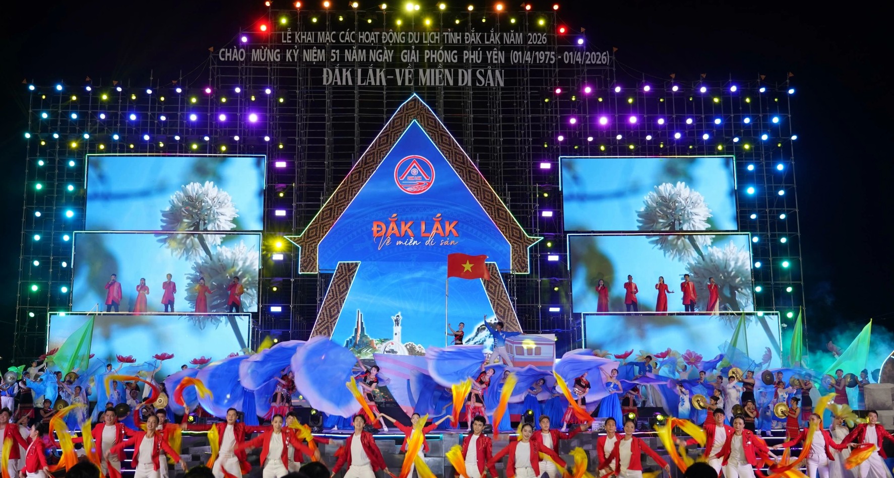 Tối 29/3, tại Quảng trường Phú Yên (phường Tuy Hòa), Lễ khai mạc các hoạt động du lịch tỉnh Đắk Lắk năm 2026 với chủ đề “Đắk Lắk - Về miền di sản” chính thức diễn ra, mở đầu cho chuỗi sự kiện kích cầu du lịch.