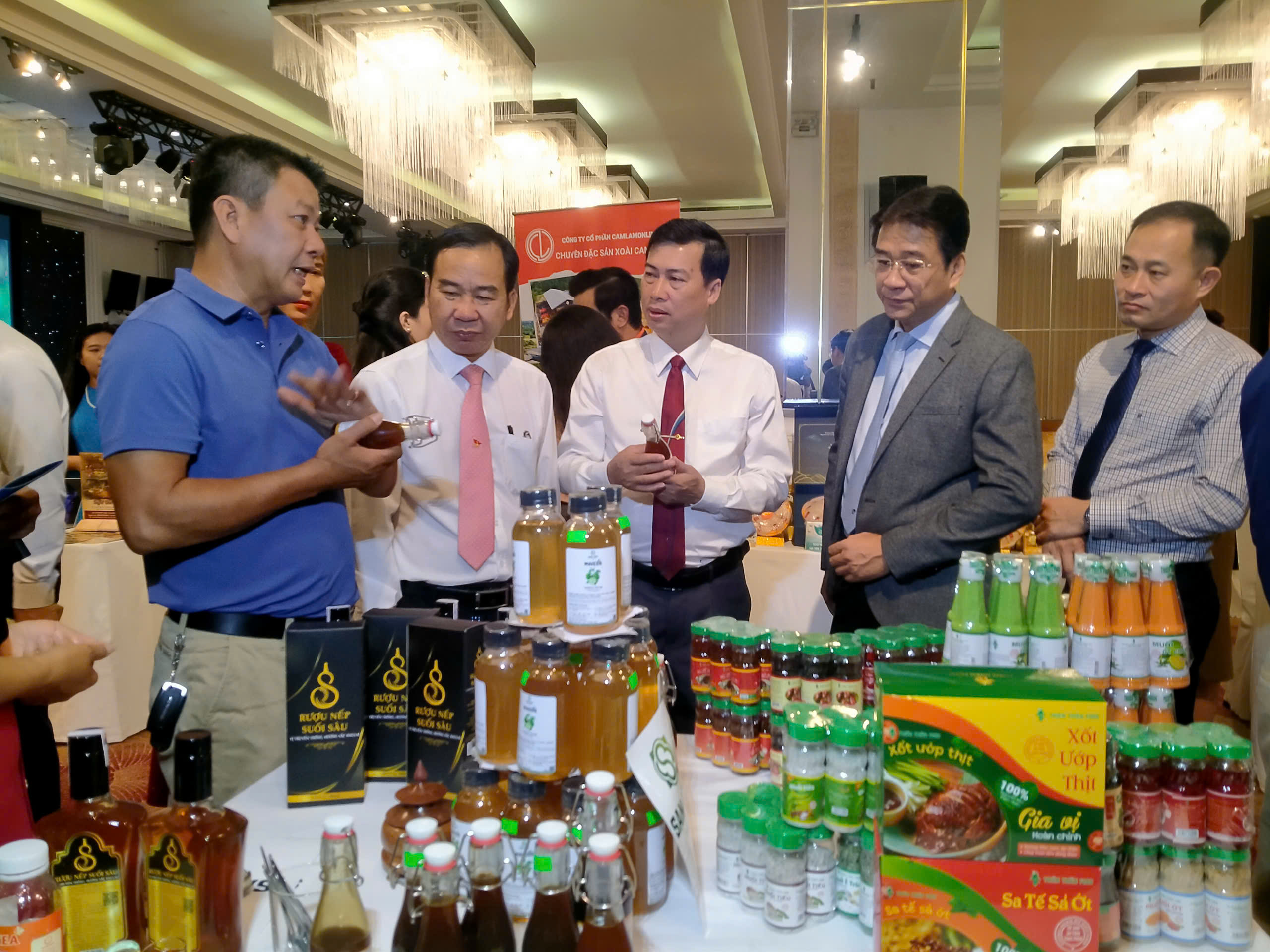 Đại biểu tìm hiểu khu trưng bày ấn phẩm du lịch và sản phẩm đặc trưng của hai địa phương