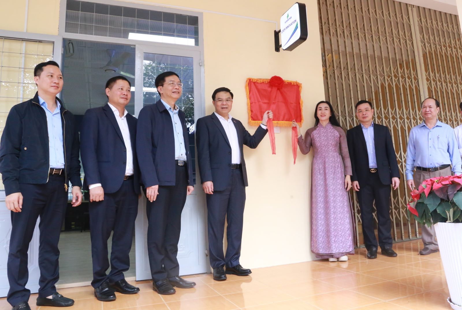 Các đại biểu tiến hành nghi thức khánh thành Phòng thực hành Giáo dục STEM.