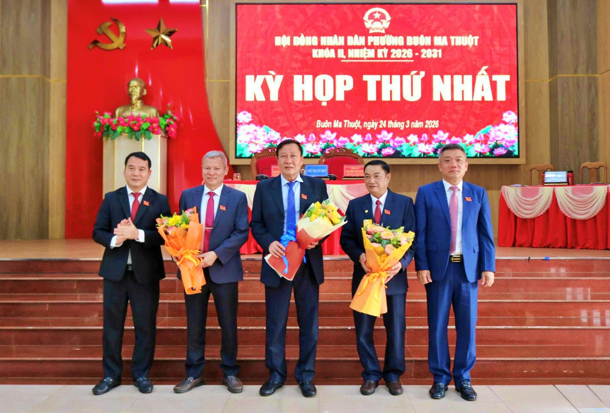 Lãnh đạo phường Buôn Ma Thuột tặng hoa chúc mừng Chủ tịch, Phó Chủ tịch và Trưởng Ban Kinh tế - Ngân sách HĐND phường khoá II, nhiệm kỳ 2026 – 2031