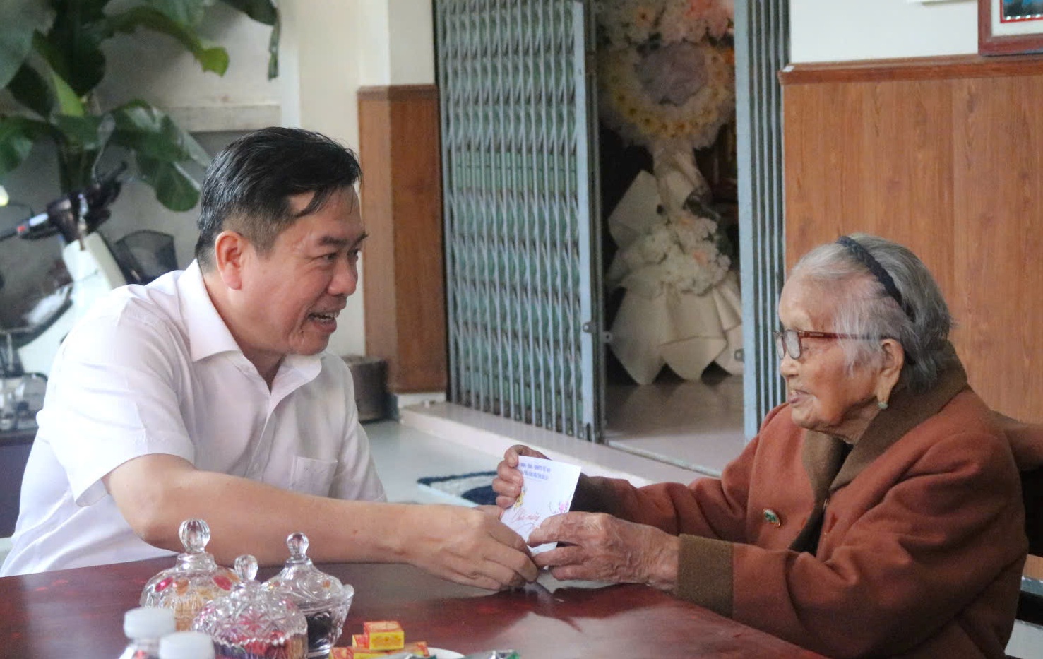 Phó Chủ tịch Thường trực Ủy ban MTTQ Việt Nam tỉnh Trần Hữu Thế tặng quà Tết Mẹ Việt Nam Anh hùng Nguyễn Thị Nhoi.