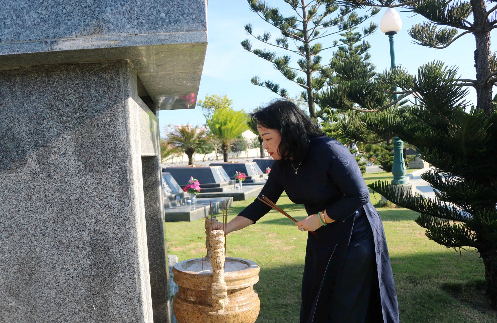 Đồng chí Cao Thị Hòa An, Ủy viên Ban Chấp hành Trung ương Đảng, Phó Bí thư Thường trực Tỉnh ủy, Chủ tịch HĐND tỉnh thắp hương tại phần mộ các liệt sĩ.