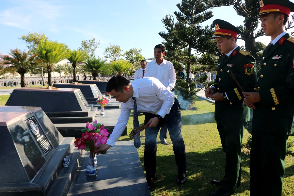 Đồng chí Đỗ Hữu Huy, Ủy viên dự khuyết Ban Chấp hành Trung ương Đảng, Phó Bí thư Tỉnh ủy thắp hương tại phần mộ các liệt sĩ.