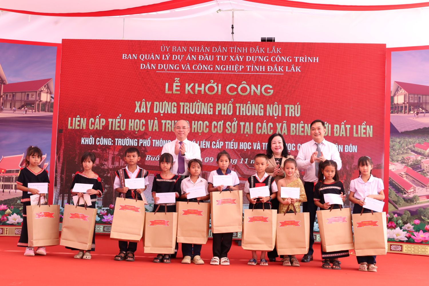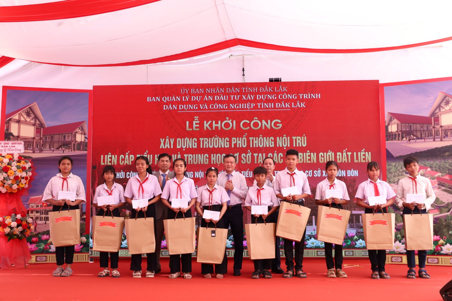Các đại biểu thực hiện nghi thức khởi công Trường Phổ thông nội trú liên cấp Tiểu học và Trung học cơ sở xã Buôn Đôn