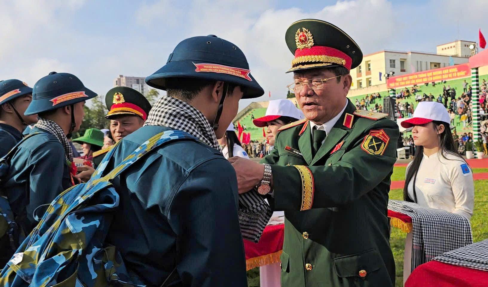 Thiếu tướng Võ Văn Hưng, Ủy viên Ban Thường vụ Đảng ủy Quân khu, Chủ nhiệm Chính trị Quân khu 5 động viên thanh niên Đắk Lắk lên đường thực hiện nghĩa vụ thiêng liêng đối với Tổ quốc.