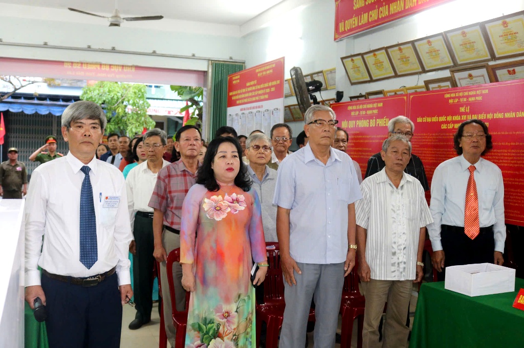 Đồng chí Cao Thị Hòa An, Ủy viên Trung ương Đảng, Phó Bí thư Thường trực Tỉnh ủy, Chủ tịch HĐND tỉnh, Chủ tịch Ủy ban bầu cử tỉnh và cử tri Khu vực bỏ phiếu số 20 làm lễ chào cờ.