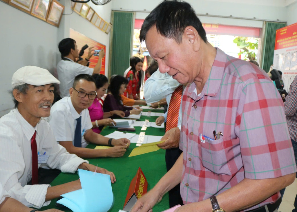Cử tri Khu vực bỏ phiếu số 20 nhận phiếu bầu.