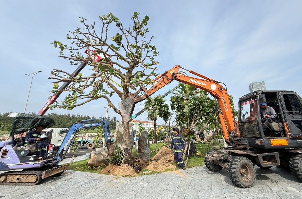 Công nhân Công ty Cổ phần Môi trường đô thị Phú Yên trồng lại những cây xanh bị bật gốc.