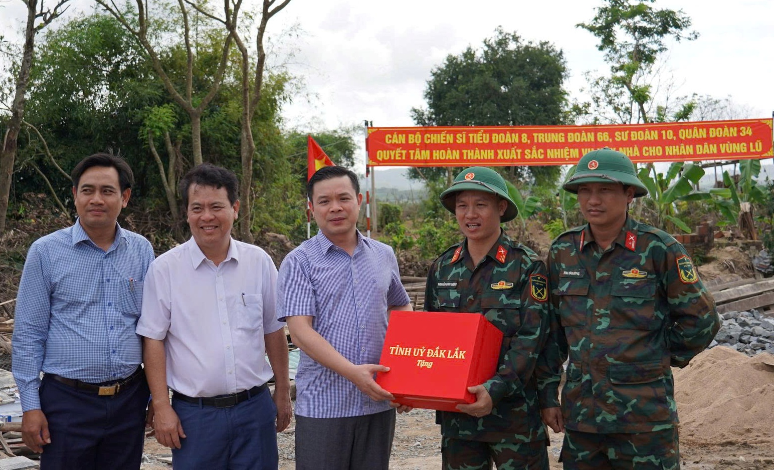 Phó Bí thư Tỉnh ủy Đỗ Hữu Huy thăm, tặng quà lực lượng hỗ trợ xây nhà cho người dân tại xã Sơn Hòa.