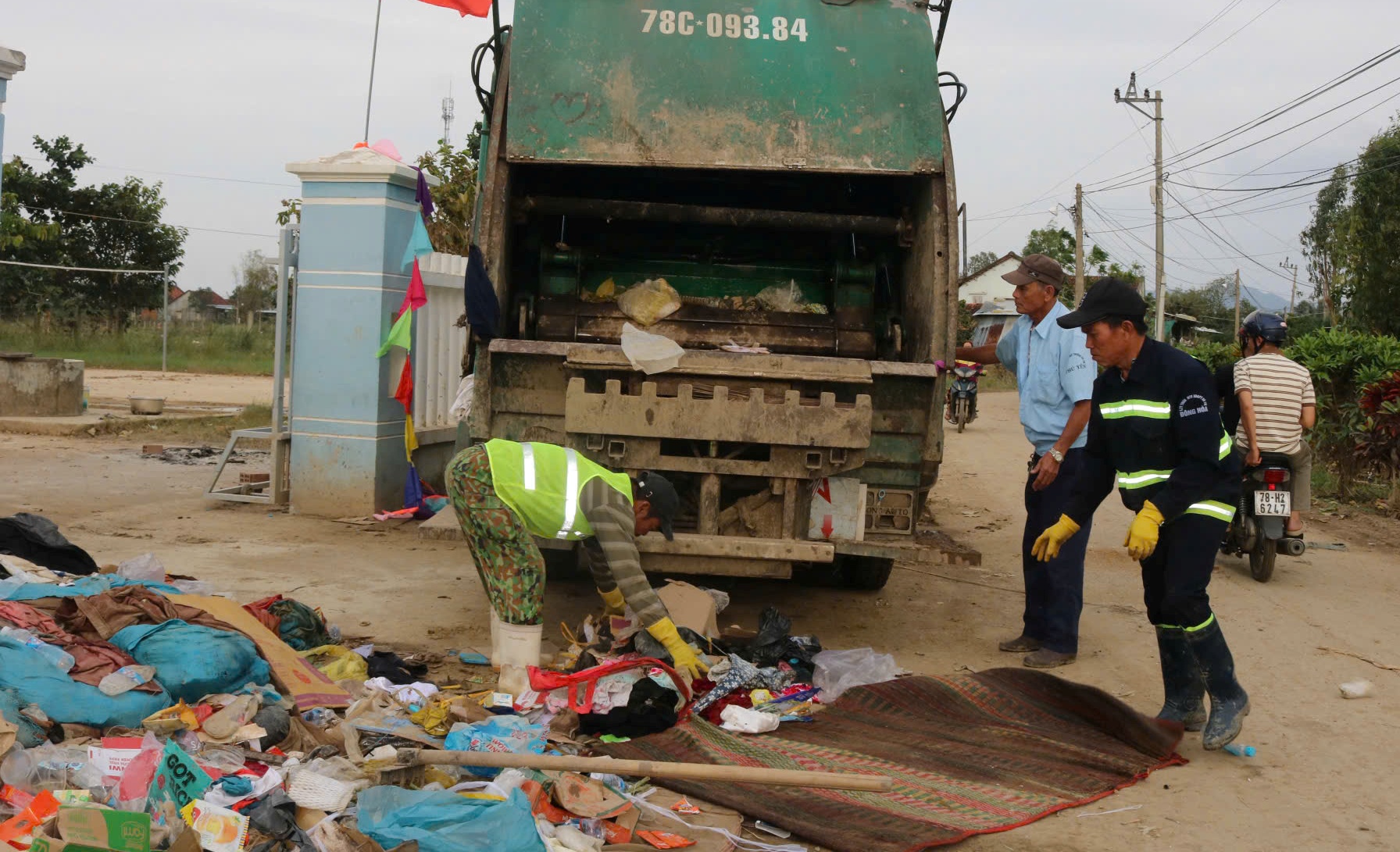 Nhân viên vệ sinh môi trường thu gom rác trên các tuyến đường ở xã Hòa Thịnh.