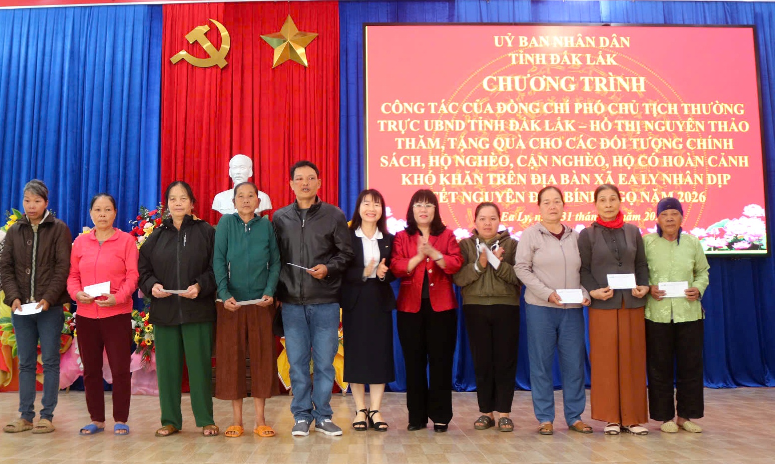 Tại các điểm đến thăm và trao quà, Phó Chủ tịch Thường trực UBND tỉnh Hồ Thị Nguyên Thảo đã trao 100 suất quà cho người dân xã Ea Ly, 100 suất quà cho người dân xã Ea Bá, 50 suất quà cho người dân xã Sông Hinh và 100 suất quà người dân xã Đức Bình. Các phần quà được trao tận tay các hộ gia đình chính sách, hộ nghèo, hộ cận nghèo và các hộ có hoàn cảnh khó khăn, thể hiện sự quan tâm, chăm lo của tỉnh đối với các đối tượng yếu thế nhân dịp Tết cổ truyền của dân tộc.