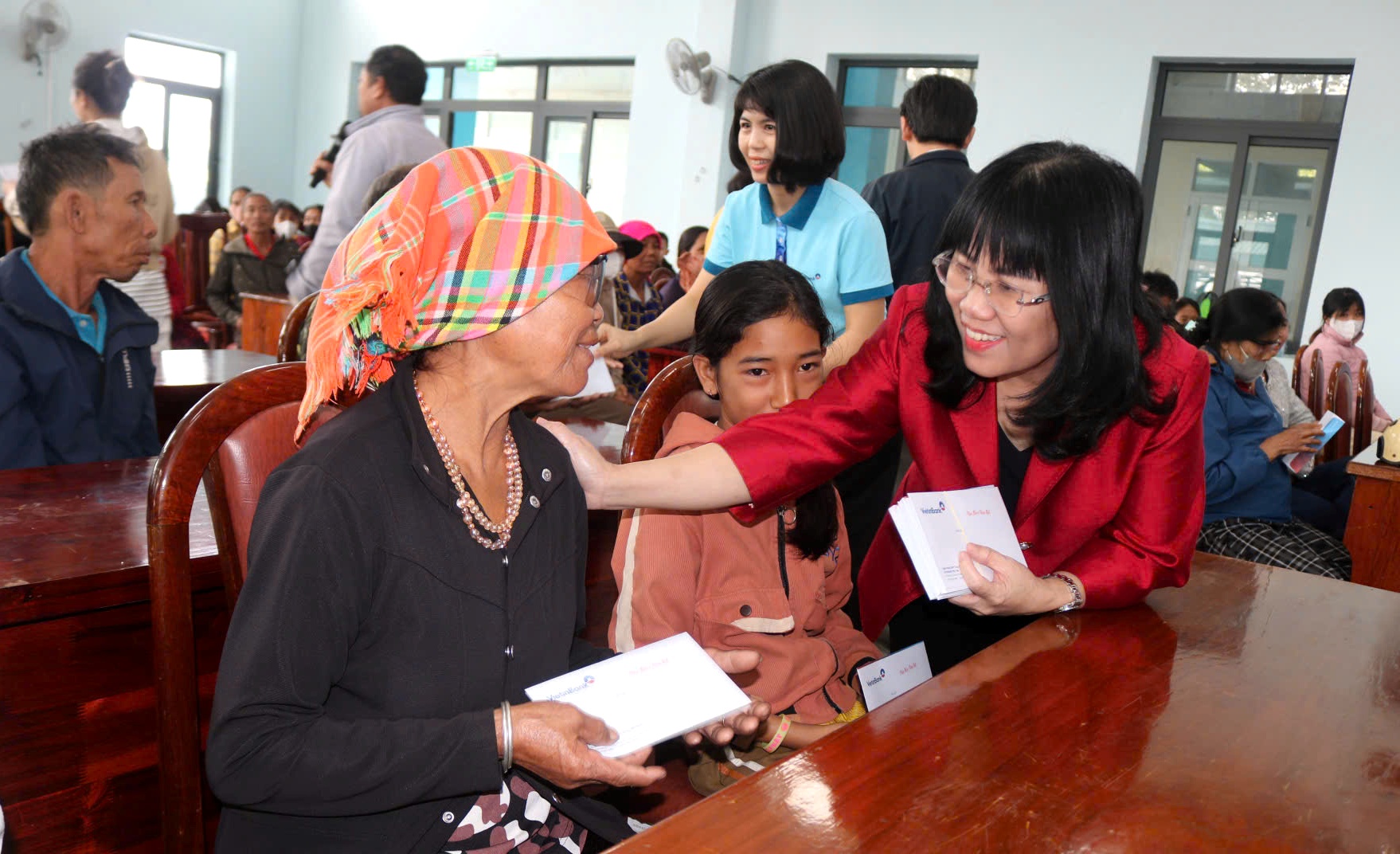Phó Chủ tịch Thường trực UBND tỉnh Hồ Thị Nguyên Thảo tặng quà cho người dân xã Ea Bá.