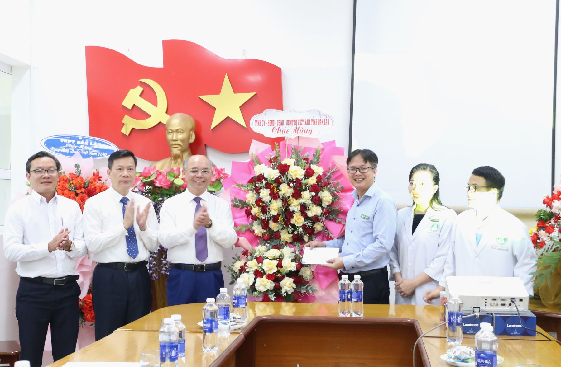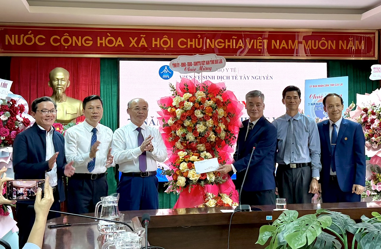 Phó Chủ tịch UBND tỉnh Trương Công Thái tặng hoa chúc mừng Viện Vệ sinh Dịch tễ Tây Nguyên.