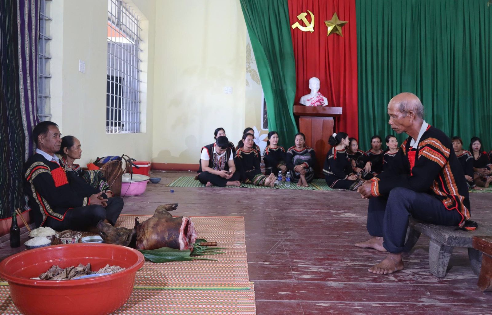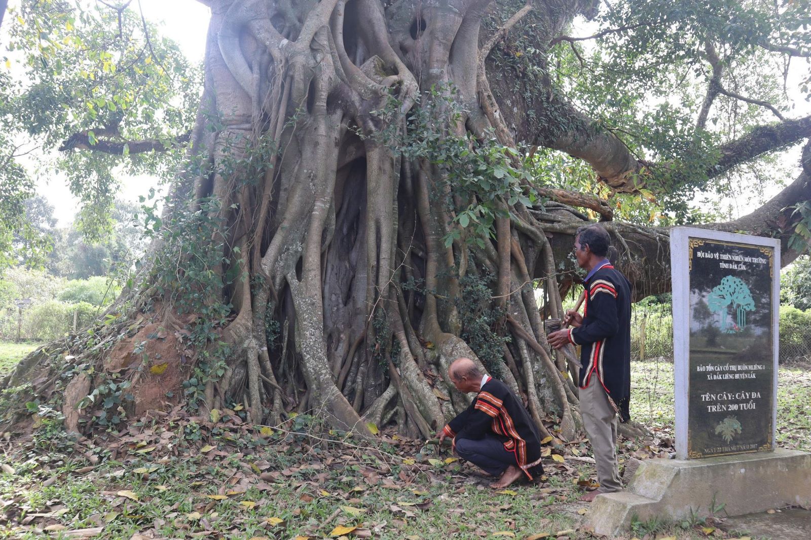 Trước khi cúng mừng thọ, thầy cúng thực hiện nghi thức cúng cây đa cổ thụ ở nhà văn hóa cộng đồng buôn M’liêng.