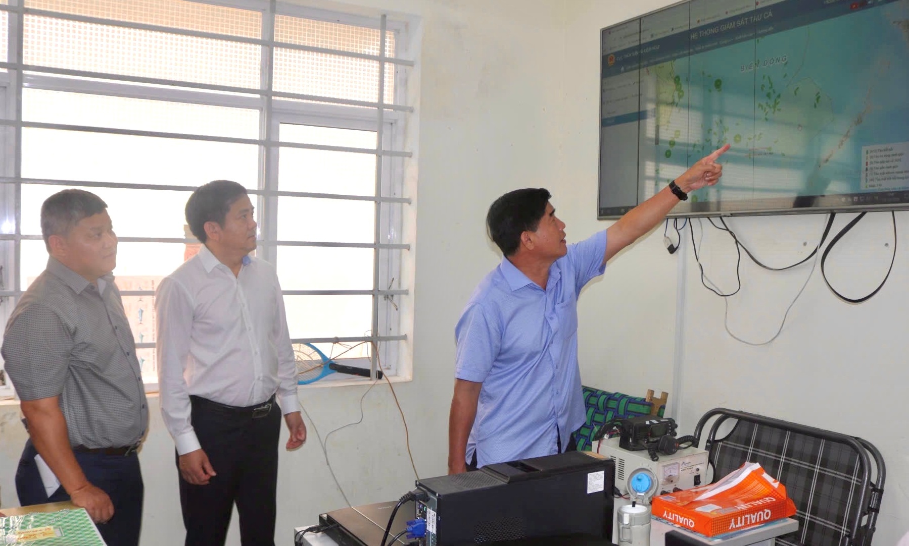 Đoàn công tác tham quan hệ thống giám sát tàu cá tại cảng cá Phú Lạc.