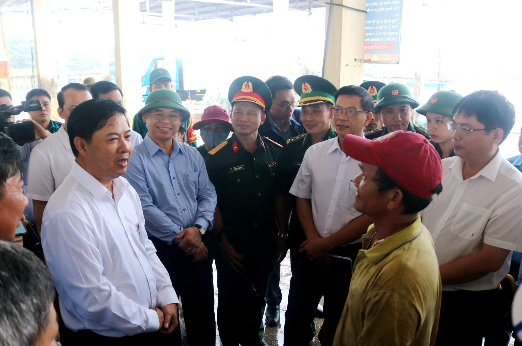 Đồng chí Lương Nguyễn Minh Triết - Ủy viên dự khuyết Ban chấp hành Trung ương Đảng, Bí thư Tỉnh ủy trò chuyện, lắng nghe tâm tư ngư dân về hoạt động khai thác và tiêu thụ thủy, hải sản.