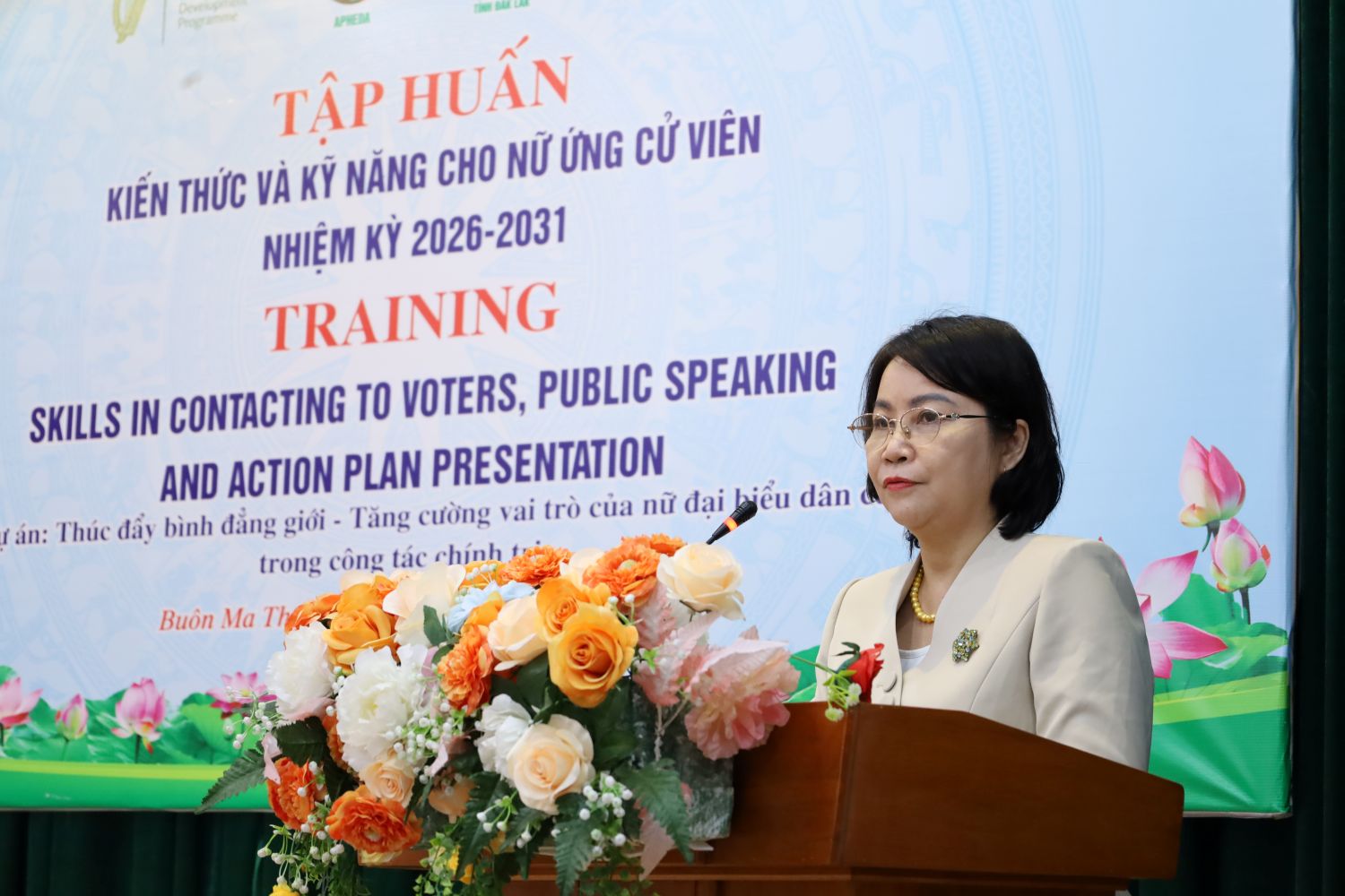 Bà Hoàng Thị Lệ Hằng – Trưởng đại diện Tổ chức APHEDA cho biết, hoạt động tập huấn này nằm trong khuôn khổ dự án "Thúc đẩy bình đẳng giới và tăng cường vai trò của người đại biểu dân cử trong công tác chính trị". Dự án do Chính phủ Úc và tổ chức Oxfam tài trợ, được triển khai tại tỉnh Đắk Lắk thông qua sự phối hợp với Hội Liên hiệp Phụ nữ tỉnh nhằm giúp các ứng cử viên chuẩn bị về tư duy, kỹ năng, kiến thức và sự tự tin để xây dựng chương trình hành động thiết thực, khả thi và trình bày trước cử tri.