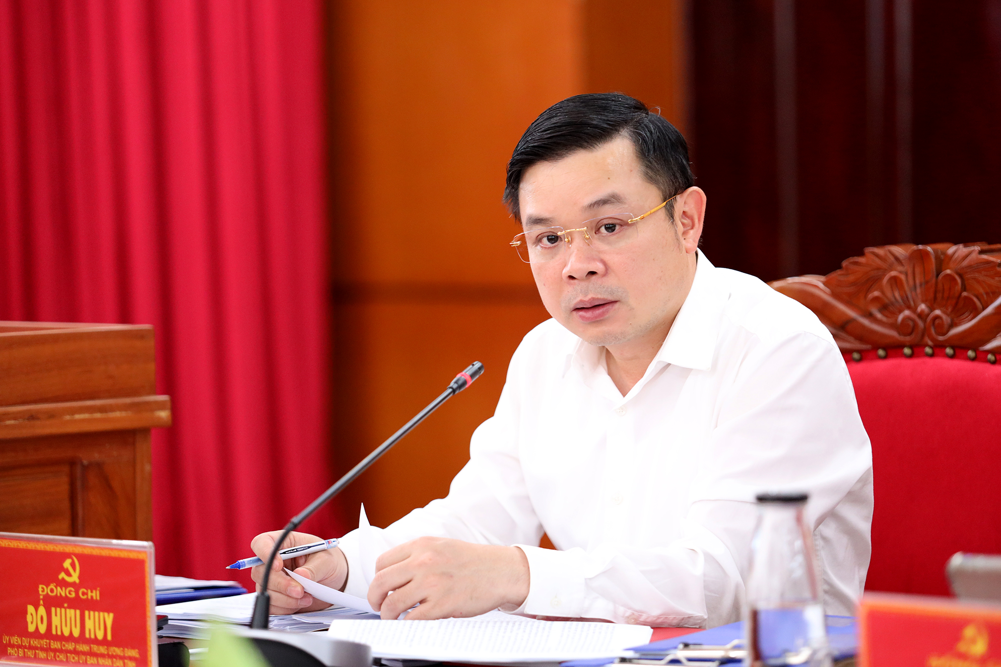 Đồng chí Đỗ Hữu Huy - Ủy viên dự khuyết Trung ương Đảng, Phó Bí thư Tỉnh ủy, Chủ tịch UBND tỉnh phát biểu tại cuộc họp.