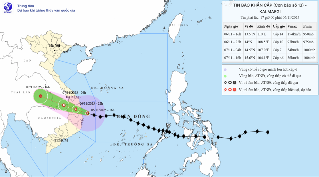 Theo bản tin của Trung tâm dự báo Khí tượng thủy văn quốc gia, bão số 13 đã mạnh lên cấp 14, giật cấp 17 và vẫn đang di chuyển rất nhanh (tốc độ khoảng 30-35 km/giờ) hướng về phía vùng biển ven bờ và đất liền khu vực Trung và Nam Trung Bộ nước ta.