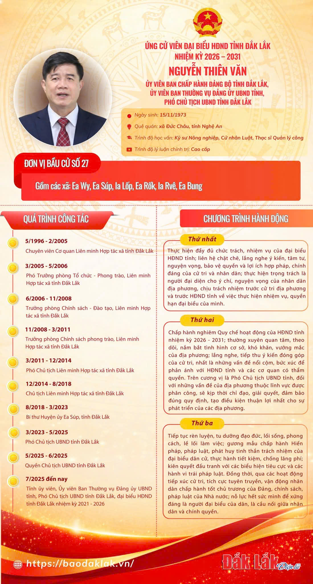 - Tiểu sử tóm tắt ứng cử Đại biểu HĐND tỉnh Đắk Lắk nhiệm kỳ 2026 – 2031: Phó Chủ tịch UBND tỉnh Nguyễn Thiên Văn (05/03/2026, 17:45)