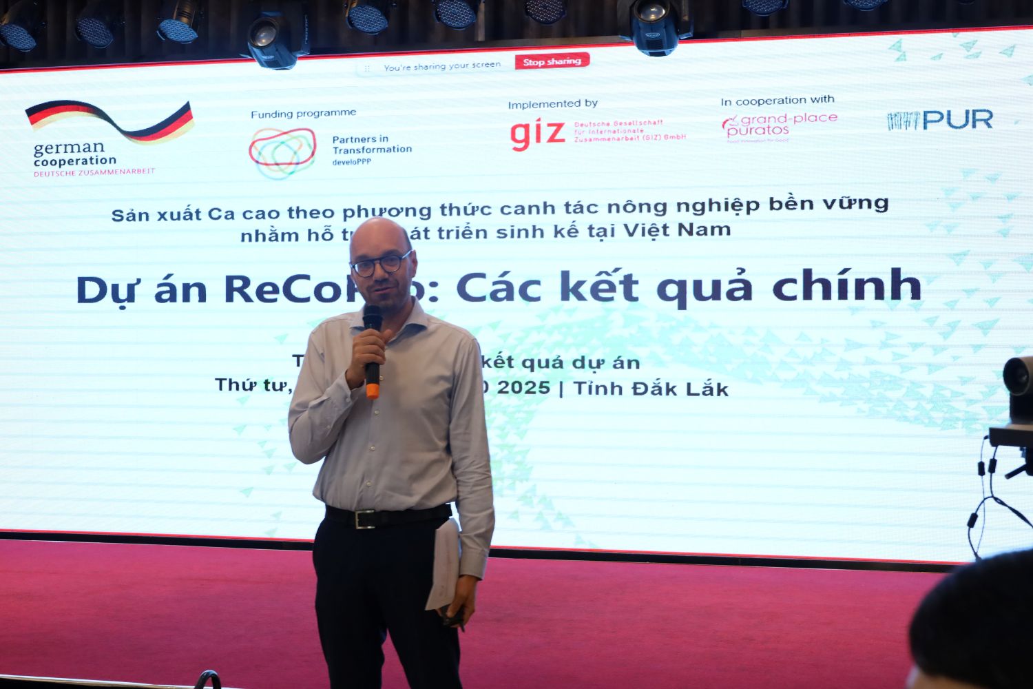 Dự án “Sản xuất ca cao tái sinh nhằm hỗ trợ phát triển sinh kế tại Việt Nam” (ReCoPro) được đồng tài trợ bởi Chính phủ Đức và Công ty Puratos Grand-Place Việt Nam, do GIZ phối hợp thực hiện cùng PGPV từ tháng 11/2021 đến tháng 11/2025 tại tỉnh Đắk Lắk và Lâm Đồng.