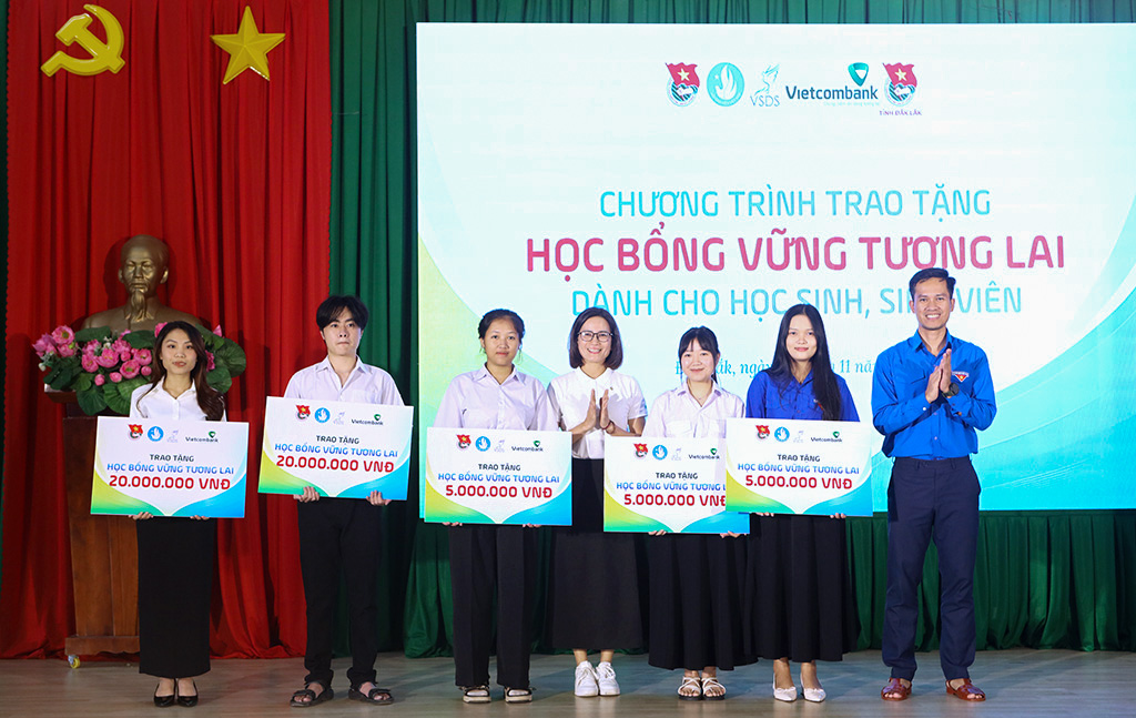 Cụ thể, trao học bổng “Thắp sáng uớc mơ” cho 60 học sinh khó khăn vùng sâu, vùng xa, vùng biên giới, chịu ảnh hưởng bởi thiên tai trong thời gian qua, mỗi suất 3 triệu đồng do Công ty CPXD Bông Sen Vàng và các công ty thành viên hỗ trợ, tổng trị giá 180 triệu đồng; trao học bổng “Vững Tương lai” cho 18 học sinh, sinh viên có thành tích học tập tốt, vượt qua hoàn cảnh khó khăn do Trung ương Hội Sinh viên Việt Nam và Ngân hàng TMCP Ngoại thương Việt Nam - Chi nhánh Bắc Đắk Lắk hỗ trợ, tổng trị giá 180 triệu đồng. Quỹ học bổng “Vừ A Dính” và Câu lạc bộ Vì Hoàng Sa - Trường Sa thân yêu trao 60 suất học bổng cho học sinh vượt khó học giỏi trên địa bàn tỉnh Đắk Lắk, mỗi suất trị giá 1 triệu đồng, tổng trị giá 60 triệu đồng.