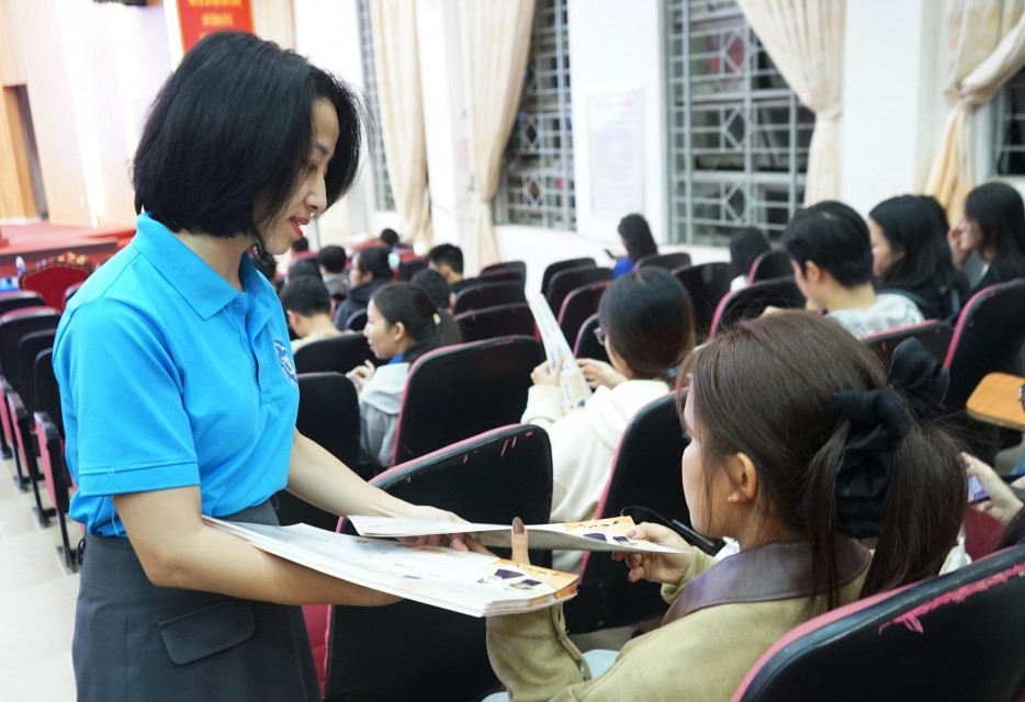 Cán bộ BHXH tỉnh phát tờ rơi, tuyên truyền chính sách bảo hiểm y tế đến sinh viên.
