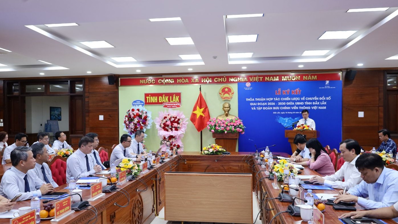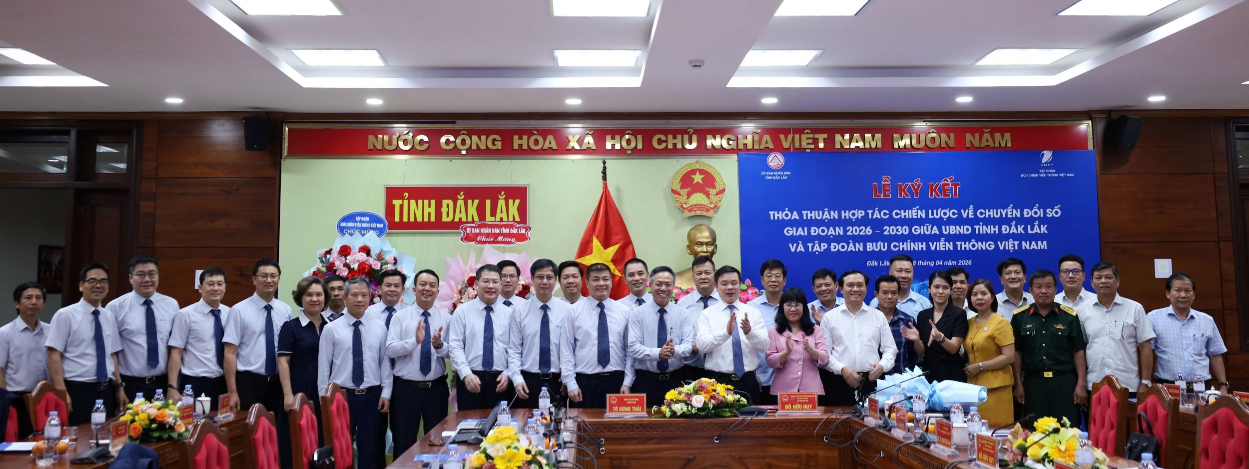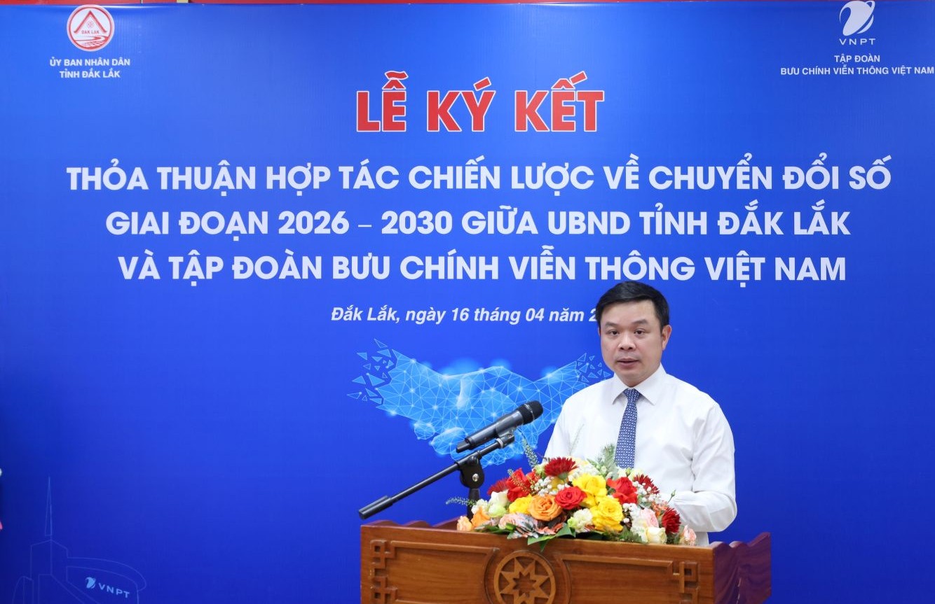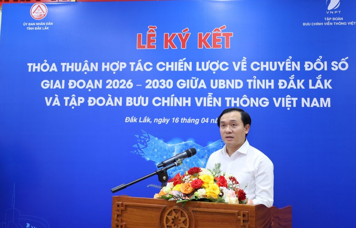 Chiều 16/4, UBND tỉnh Đắk Lắk đã tổ chức Lễ ký kết thỏa thuận hợp tác về chuyển đổi số tỉnh Đắk Lắk giai đoạn 2026 – 2030, định hướng đến năm 2035 với Tập đoàn Bưu chính Viễn thông Việt Nam (Tập đoàn VNPT).