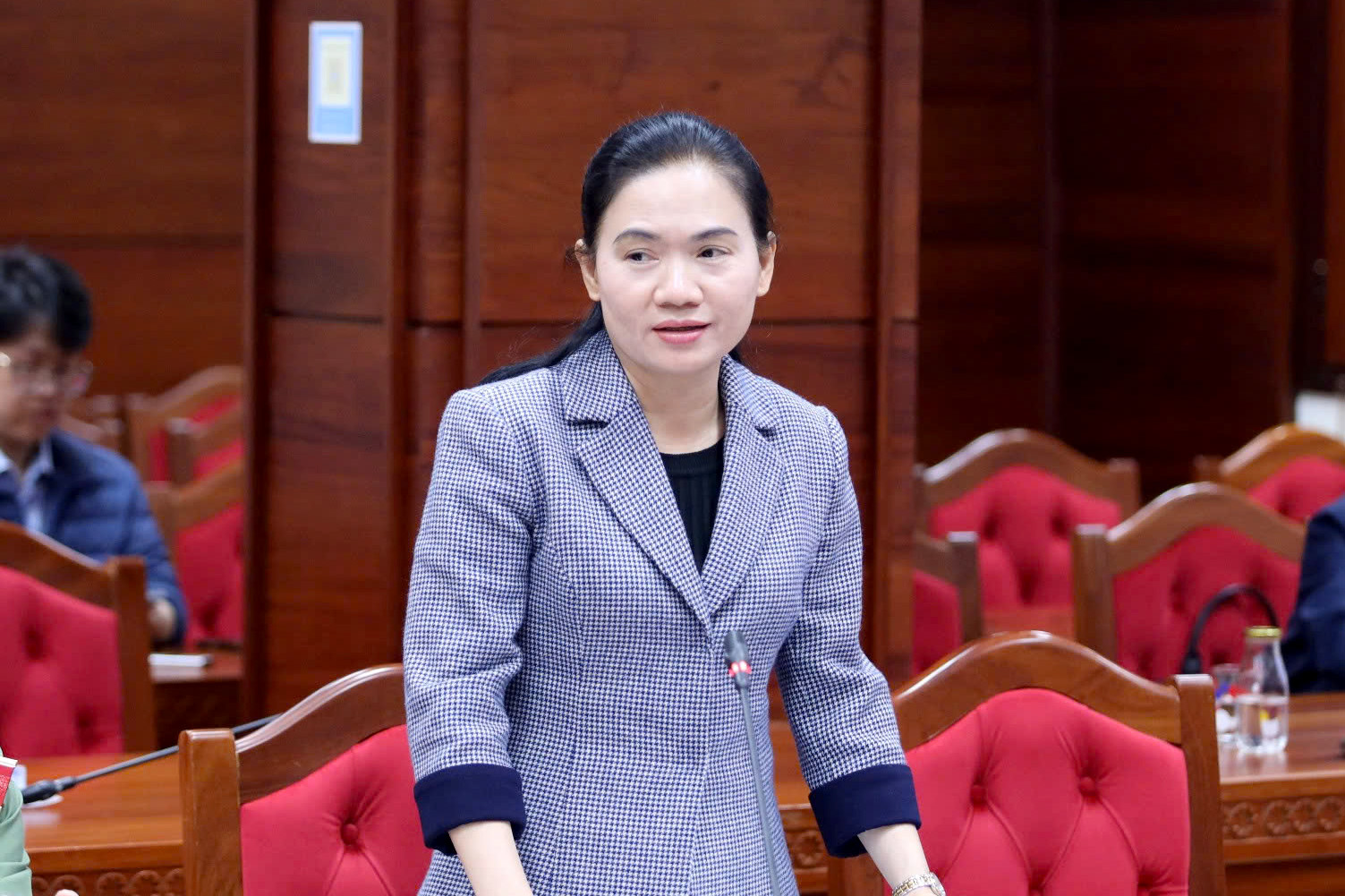 Đồng chí Đinh Thị Thu Thanh - Ủy viên Ban Thường vụ Tỉnh ủy, Trưởng Ban Tuyên giáo và Dân vận Tỉnh ủy phát biểu tại Phiên họp.